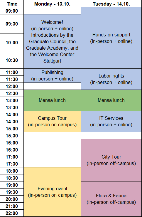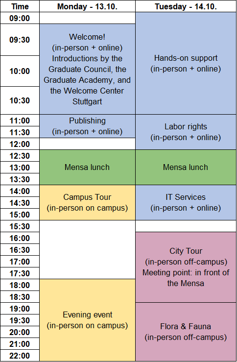 You will get to know your PhD representatives and the Graduate Academy and learn how they support you. There will also be an introduction by the Welcome Center Stuttgart.